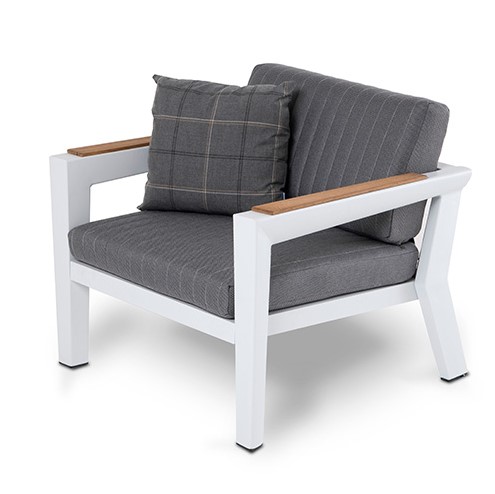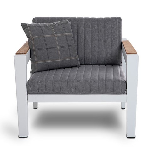 Кресло Фореста металлический каркас из алюминия. Подлокотники со вставками из тикового дерева. Размер: ширина 75 см, длина 80 см, высота 56,5 см