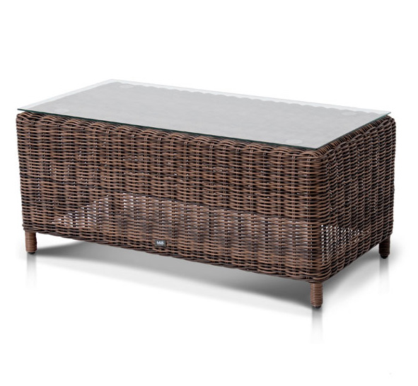 Журнальный столик Макиато. Алюминиевый каркас вручную оплетен искусственным ротангом шоколадного оттенка. Стеклянная столешница выполнена из крепкого закалённого стекла толщиной 5 мм. Плетение круглое. Размер 100х50х42 см