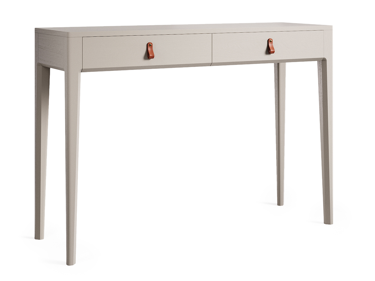 Универсальный консольный стол, который уверенно выполнит функцию косметического столика. Компактные габариты позволяют использовать стол в узком холле или небольшой комнате, а утонченный образ модели поддержан оригинальной фрезеровкой ножек и ручками из натуральной кожи, выполненными вручную мастерами The IDEA.Особенности.Заметная текстура дуба на всех деталях, покрытых эмалью.Универсальная высота 80см.Ручки из мягкой итальянской кожи.Латунированные крепления ручек.Декоративная отделка задней стенки в цвет изделия позволяет разместить стол в центре помещения.Скрытые направляющие Blum с доводчиками.Износостойкие каркасы ящиков из ЛДСП.Материалы.Каркас и ножки – массив дуба.Фасады – МДФ, натуральный шпон дуба.Ящики и перегородки – ЛДСП, светло-серый.Фурнитура – направляющие с плавным закрыванием, стальные крепежные элементы. Ручки – натуральная кожа, латунь.Покрытие – лак / эмаль.Внимание! Стол недоступен к заказу в отделке «Натуральный дуб»