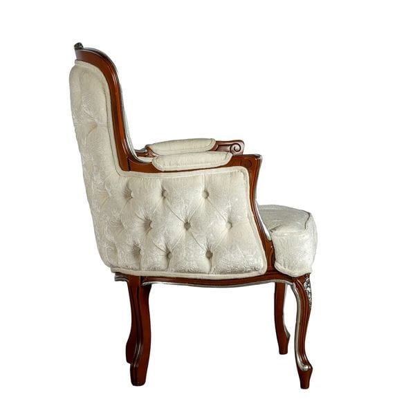 Кресло «LOTTI» это утонченный представитель стиля рококо. Узнаваемый классический силуэт, характерные подушечки подлокотников и комфортная широкая спинка делают модель совершенным элементом антуража классических гостиных, кабинетов и домашних библиотек. Создание кресла невозможно представить без участия ремесленников, которые кропотливо создают капитоне или выполняют художественную резьбу.Каркас:древесина твердых пород, хвойный брус и многослойная влагостойкая березовая фанера, покрытая пенополиуретаном и синтепоном. Эластичное основание сидения и спинки из резинотканевых ремней.Наполнение спинки:высокоэластичный, латексоподобный ППУ, покрытый 100 полиэстеровым слоем.Наполнение подушек сиденья:высокоэластичный, латексоподобный ППУ, покрытый 100 полиэстровым слоем.Наполнение локотника:высокоэластичный, латексоподобный ППУ различной плотности, покрытый 100 полиэстеровым слоем.Съемность чехлов:чехлы не съемные.Опоры:Высокие опоры являются частью деревянного каркаса, который также включает в себя основание, подлокотники, спинку, корону.Спинка и подлокотники изготавливаются только с тесьмой, либо крученым шнуром из басонных изделий. Кресло LOTTI белое.