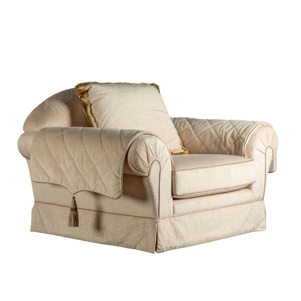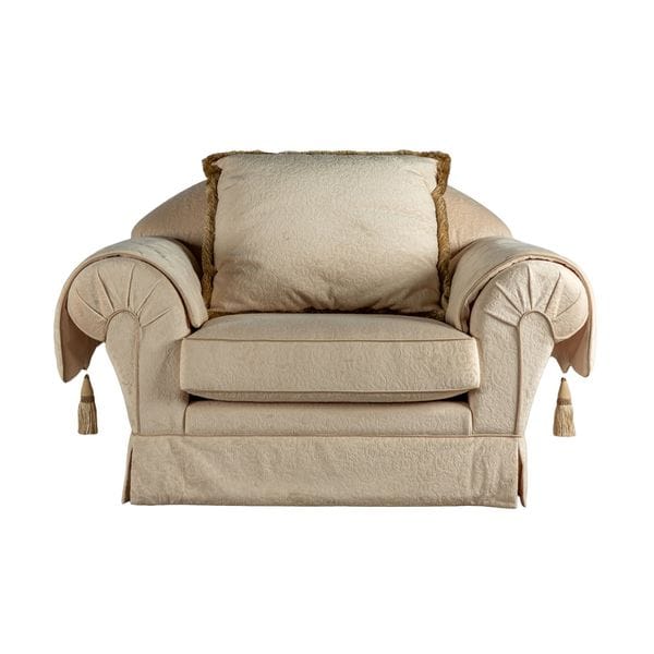 Кресло «ROMANO» выполнено в классическом стиле. Дизайн кресла «ROMANO» продуман до мелочей. Использование разнообразных отделок, бахромы, тесьмы, шнуров, сочетание текстиля различных фактур и прочие дизайнерские ухищрения создают особое настроение и придают креслу неповторимый стиль.Каркас: древесина твердых пород, хвойный брус и многослойная влагостойкая березовая фанера, покрытая пенополиуретаном и синтепоном. Эластичное основание сидения и спинки из резинотканевых ремней.Наполнение спинки: высокоэластичный, латексоподобный ППУ, покрытый 100 полиэстеровым слоем.Наполнение подушек сиденья: высокоэластичный, латексоподобный ППУ, покрытый 100 полиэстровым слоем.Наполнение подушек спинки: смесь натурального гипоаллергенного пуха, пера и синтетического наполнителя.Наполнение локотника: высокоэластичный, латексоподобный ППУ различной плотности, покрытый 100 полиэстеровым слоем.Съемность чехлов: Съемные чехлы с подушек сиденья и спинки.Опоры: модель оснащена опорами из массива дуба, высотой 6 см.Декор: по периметру основания модель декорирована тканевым кантом. Подлокотники модели декорированы специальными тканевыми вытачками.