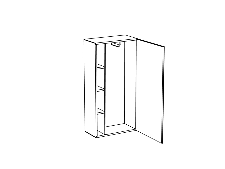 Шкаф с двумя отделениями за одной распашной дверью: в левом отделении - щитовые полки, в правом - выдвижная штанга. Дверь открывается по принципу «нажал-открыл». Шкаф крепится к стене.