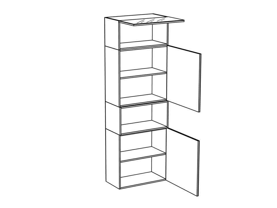 Шкаф включает в себя два отделения одинакового размера с распашными дверями и полками, разделенные нишей, и отделение за подъемной дверью над ними. Двери шкафа открываются по принципу «нажал-открыл». Шкаф установлен на ножки с возможностью регулировки по высоте.