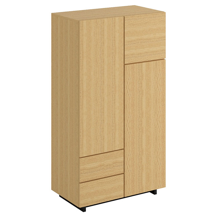 В шкафу слева располагаются два выдвижных ящика и большое отделение за распашной дверцей. В нём предусмотрена установка как штанги для хранения одежды на плечиках, так и трех съёмных полок. Справа два отделения за распашными дверцами. Снизу в большом отде...