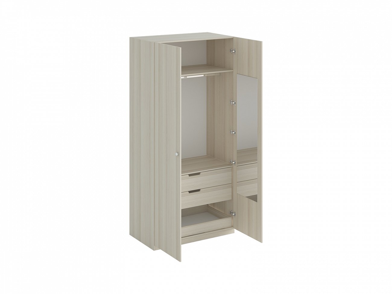 Шкаф двухдверный внутри расположены штанга для одежды, 2 полки, 3 выдвижных ящика. На одной дверце шкафа с внутренней стороны расположено зеркало. Установлен на регулируемые опоры. Данную мебель рекомендуется крепить к стене. Ручки продаются отдельно, не входят в комплектацию шкафа.
