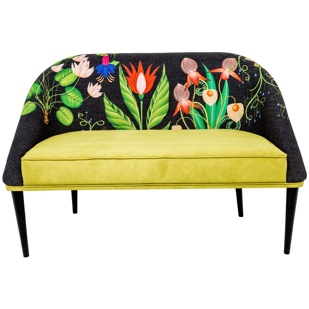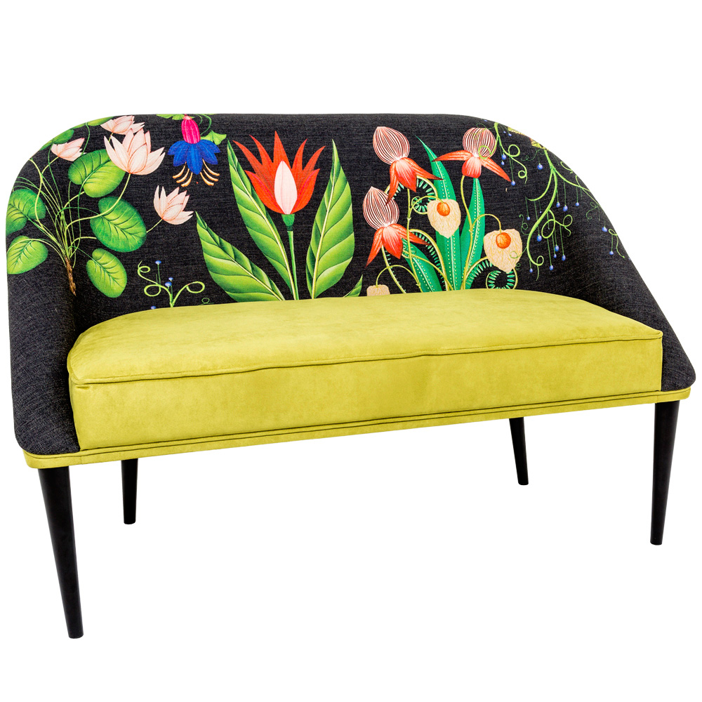 Диван «Тропический лес / Мёд» располагает множеством подтверждений своего названия. На его спинке расцвели пышные букеты экзотических цветов. Сиденье, выполненное из мягкой искусственной замши, привлекает своим сочным цветом зелени, которой коснулось солнце. Изящные ножки, идеальные формы, яркий окрас. Что ещё нужно для создания восторженного джунгли-эффекта?