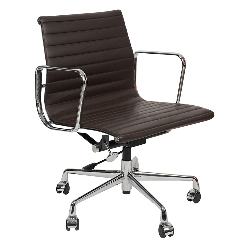 Эстетическая легкость конструкции кресел Eames Aluminum Group воплощена в алюминиевых деталях, каркас обтянут натуральной кожей, которая адаптируется к формам тела и обеспечивает великолепный комфорт даже без мягкого внутреннего наполнителя. Высота регулируется благодаря специальной системе пневморегулировки, в то время как смещенная ось обеспечивает мягкое качание. Усовершенствованные модели серии Soft Pad Group обладают еще одним неоспоримым преимуществом. Мягкие секции-валики создают безукоризненное удобство, не нарушая при этом традиционных классических линий кресел Eames. Кресло Eames Style кофейная кожа.