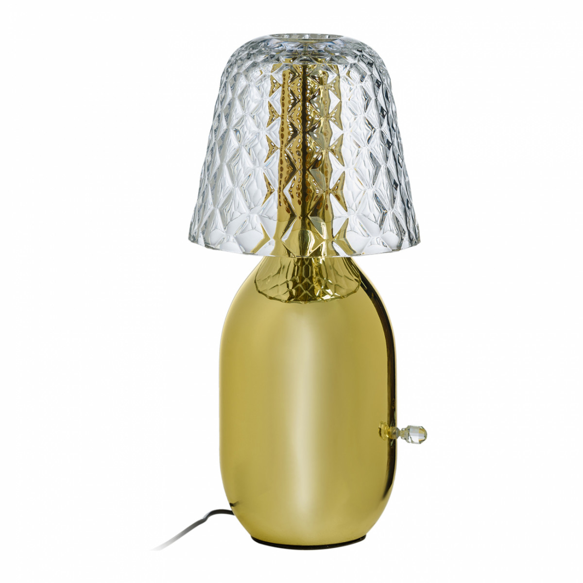 Настольная лампа Kanye непременно придется по вкусу любителям красивых предметов. Простота формы и органичность исполнения воплощены в этой настольной лампе, в любом помещении вашего дома она создаст неповторимый домашний уют. Её плафон выполнен из рифленого прозрачного стекла, а основание из металла золотого цвета. Настольная лампа Kanye прекрасно впишется в интерьер спальни, зала, коридора, прихожей или других уголков дома.